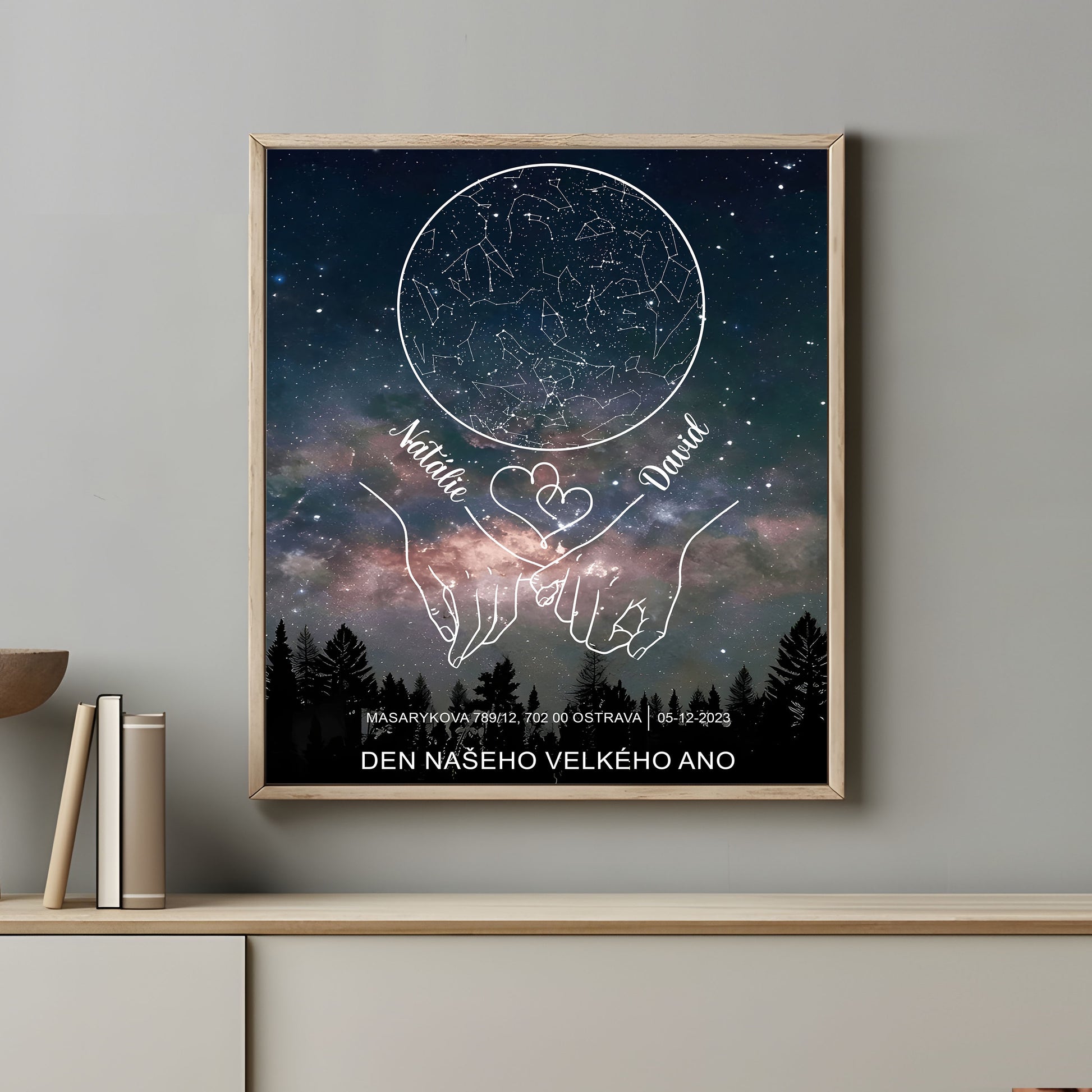 Oslavte okamžik, kdy začalo vaše navždy, s tímto elegantním personalizovaným plakátem hvězdné mapy určeným k zachycení lásky, spojení a osudu. Obsahuje jemné liniové umění páru držícího se za ruce pod vlastní hvězdnou mapou, toto umělecké dílo zobrazuje přesné uspořádání hvězd z vašeho výjimečného data a místa. Vytištěno se jmény, místem a datem výročí, proměňuje významný okamžik v nadčasové nástěnné umění, které vypráví váš příběh lásky moderním a emotivním způsobem. Ideální pro Valentýna, výročí nebo milníkové okamžiky, tento plakát je srdečnou připomínkou, že vaše společná cesta byla vepsána do hvězd.